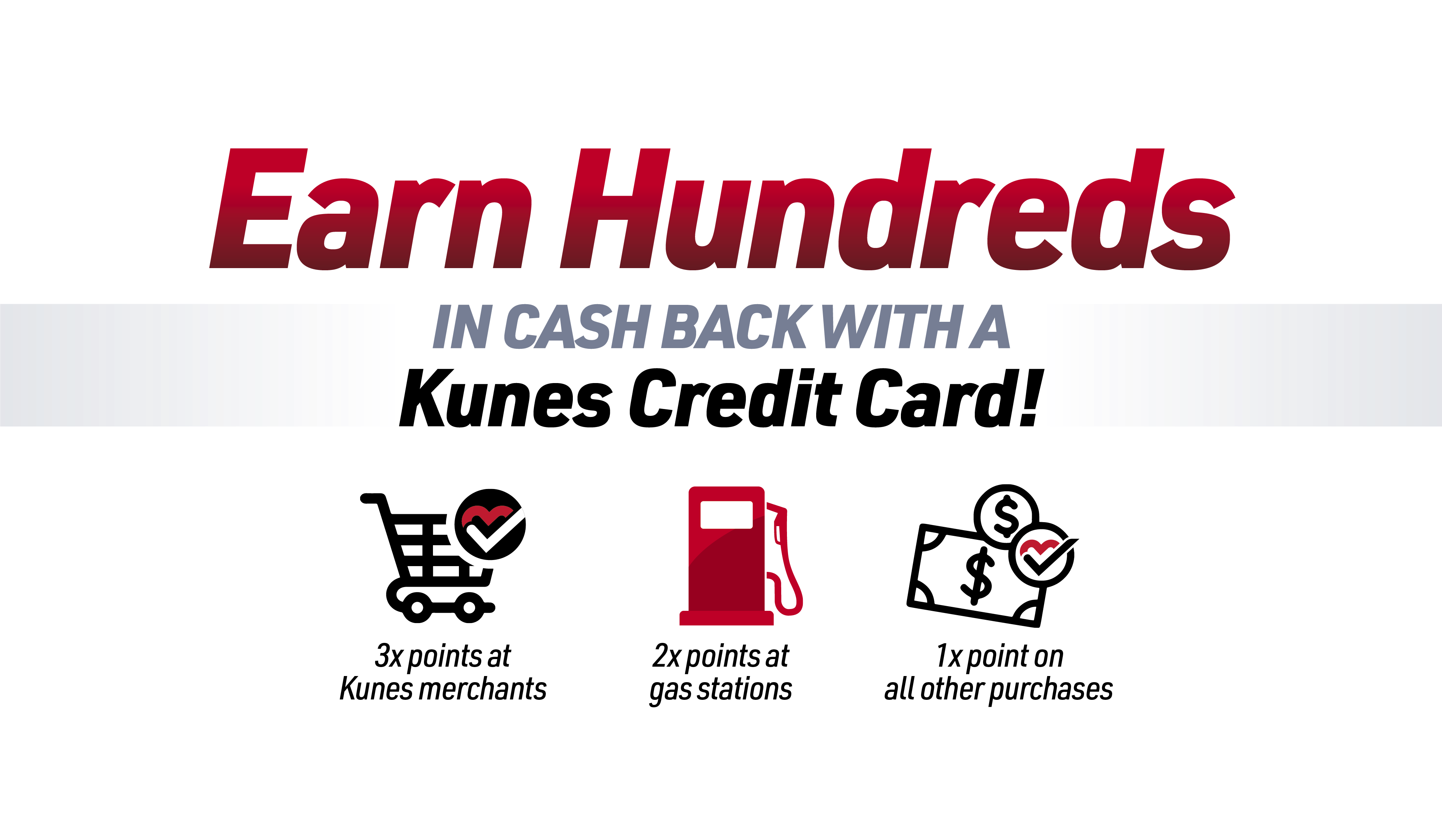 With the Kunes Platinum Rewards Mastercard, you earn cash back on every purchase plus 2x points at gas stations, 3x points at Kunes Merchants and 1x points on all other purchases.